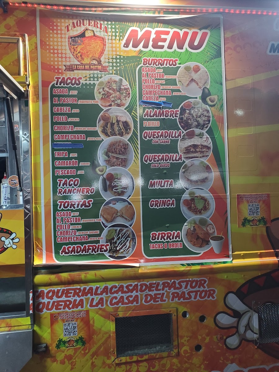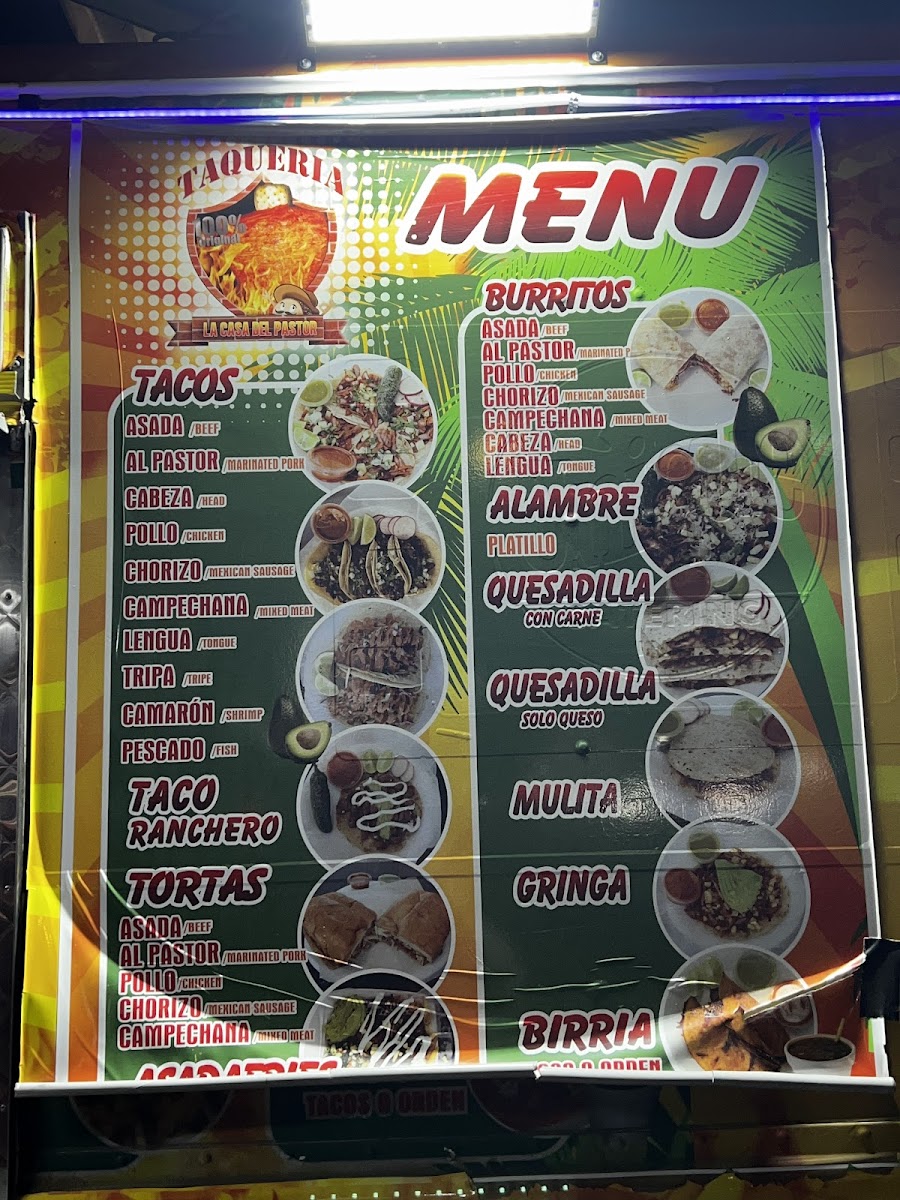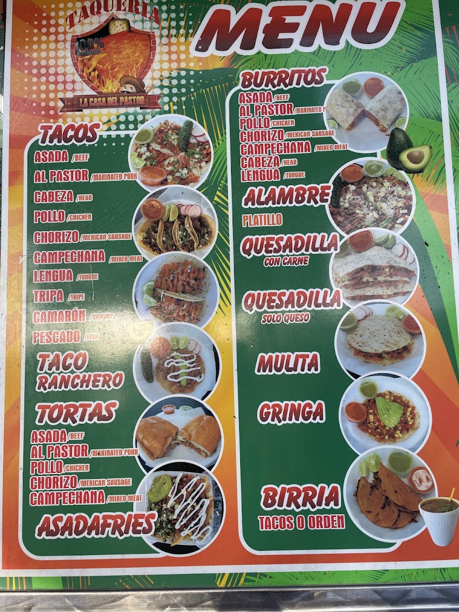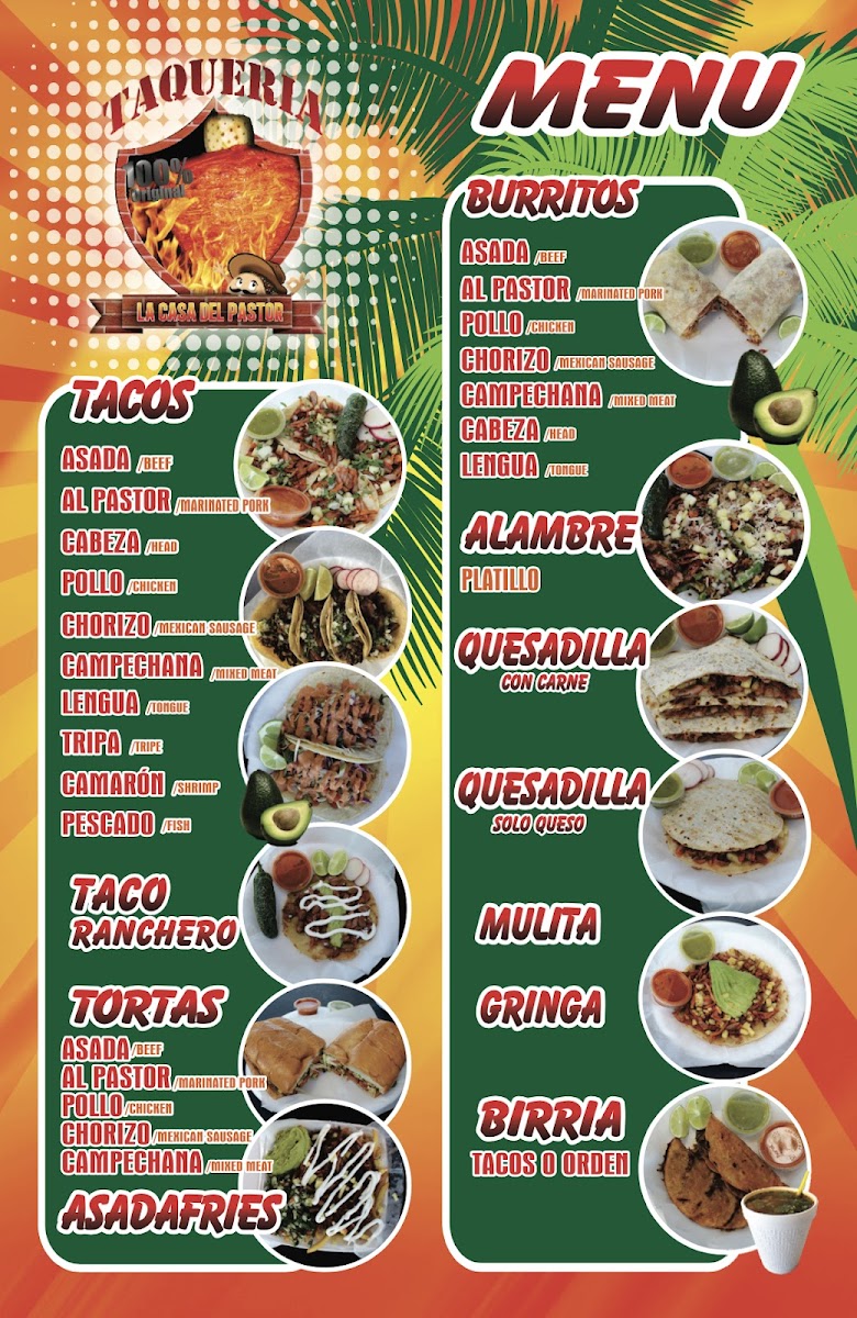 The menu at Taqueria La Casa Del Pastor offers a delightful variety of authentic Mexican dishes that are sure to satisfy any craving. For taco lovers, the restaurant features options like Asada, Al Pastor, Cabeza, and Pollo tacos, each packed with flavor. If you're in the mood for something heartier, the Burritos section has mouthwatering choices, including Asada, Al Pastor, Pollo, Chorizo, and the standout Campechana burrito. For a satisfying sandwich, their Tortas come in familiar favorites such as Asada, Al Pastor, Pollo, and Chorizo. In addition to these, the menu includes several specialty items, such as Lengua, Tripa, Camarón, Pescado, and the flavorful Taco Ranchero, making it easy to explore a range of tastes. Whether you're in the mood for tacos, burritos, or tortas, this spot has something for everyone, all served with the vibrant and bold flavors of traditional Mexican cuisine.